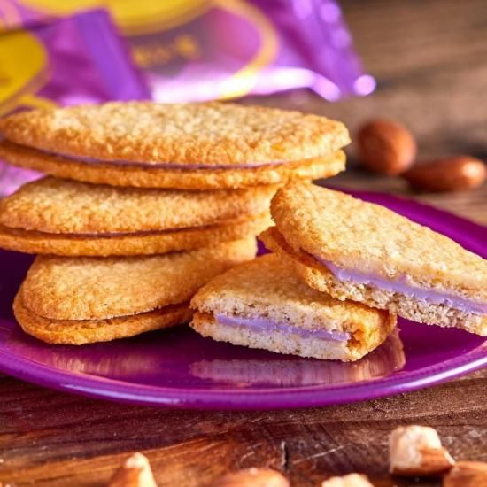 香ばしいアーモンドのサクッとしたクッキーに紅芋味のチョコレートがサンドした商品です^^